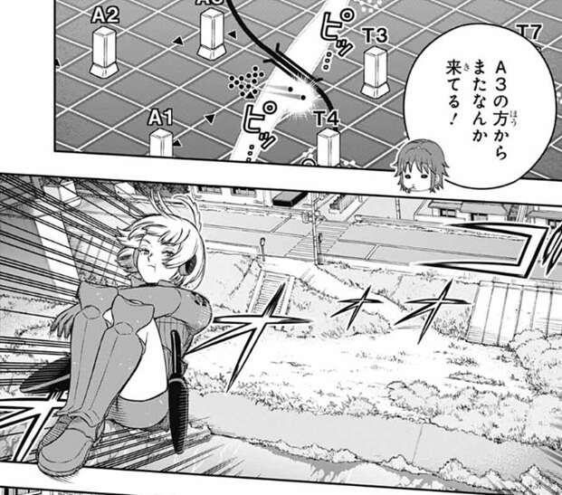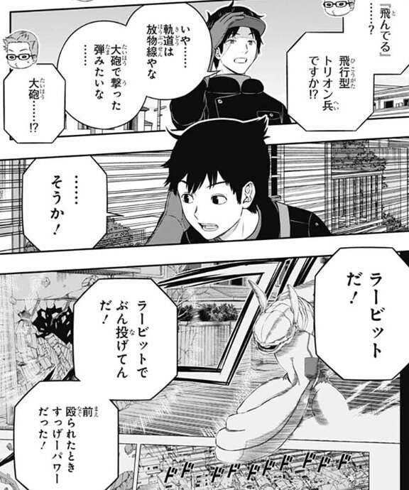 A3の方角になにかが飛んでいる事に気付いた隠岐は古寺に報告、古寺は飛行型トリオン兵ですか!?と隠岐に質問しますが、いや……軌道は放物線で大砲で撃った弾みたいな……、と隠岐は答えます。その通信を聞いていた奥寺は大規模侵攻でラービットに殴られた時の事を思い出し、ラービットを使って隊員をぶん投げている事に気付きます。