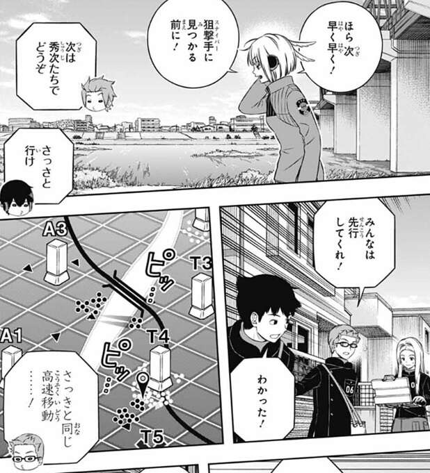 小南と木崎がまずは川を渡り、次は迅の番ですが迅は順番を三輪に譲ろうとし、三輪からさっさと行けと言われます。古寺は奥寺達に先行するように指示した後、MAPを見てさっきと同じ高速移動だと分かると、柿崎隊と諏訪隊にA3の方角を見るように指示します。