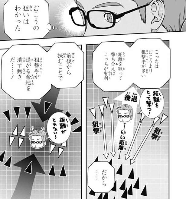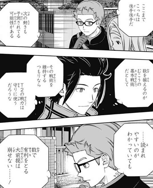 一方、古寺は自分の判断がむこうに予測されている事を前提にして動くべきだと考え、おれの打つ手が読まれるなら……、と第255話で木虎に言われた、第2試験ではもっと私たちを上手く使ってください、という言葉を思い出します。そして、古寺は自分じゃない一手を混ぜればいいと考え諏訪に連絡すると、三雲を使って三雲の考えた一手を作戦に混ぜようとします。