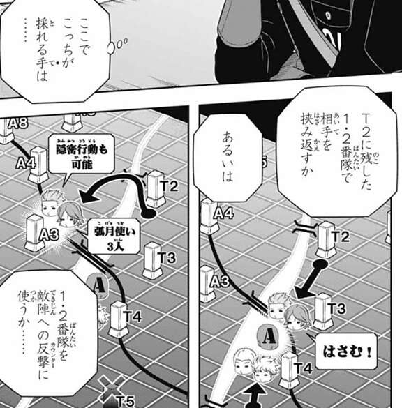 さらに南側の太刀川達が速攻をかけてきたのは、臨時部隊の合流を誘導する為と推測し、古寺は臨時部隊側が採れる手を考えます。T2に残した歌川1番隊と王子2番隊で相手を挟み返す作戦か、あるいは歌川1番隊と王子2番隊をA3ターミナル付近の敵陣へのカウンターに使う作戦を古寺は考えます。