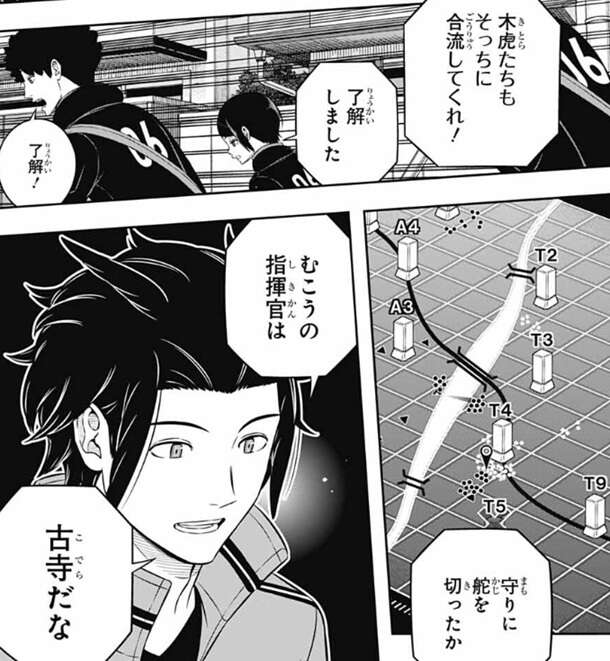 さらに古寺は若村11番隊に柿崎隊、諏訪隊と合流するよう目標を変更、木虎達にもそっちに合流するように指示します。しかし、嵐山は臨時部隊がT2の戦力を守りに使ったことから、指揮官が古寺だと言い当てます。