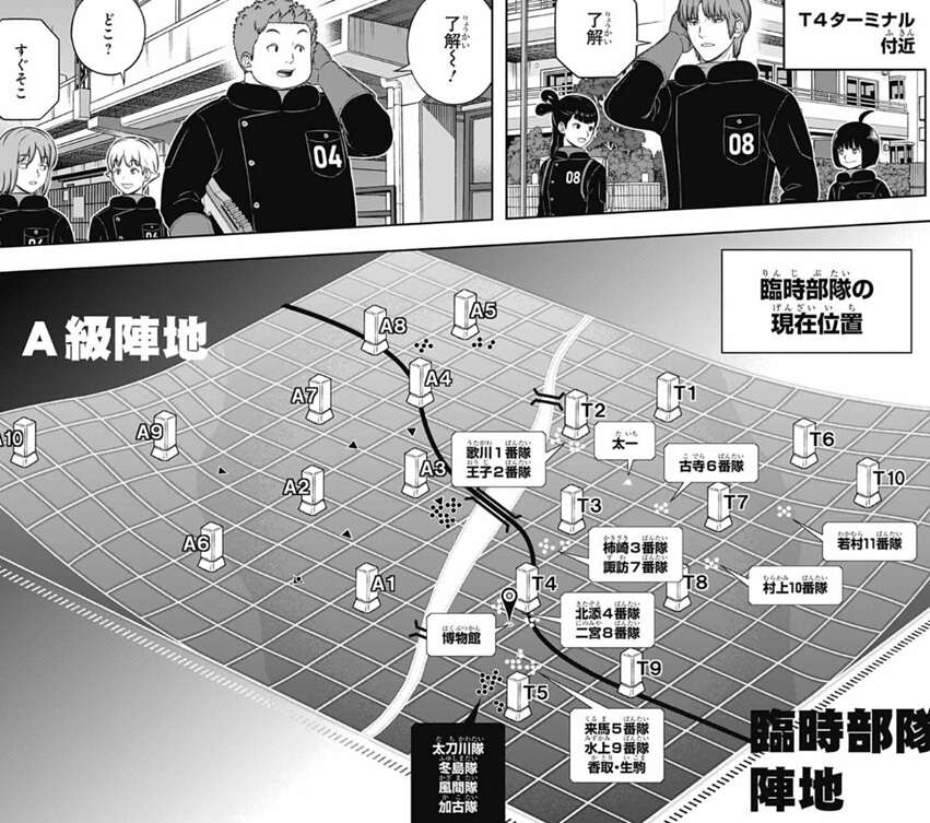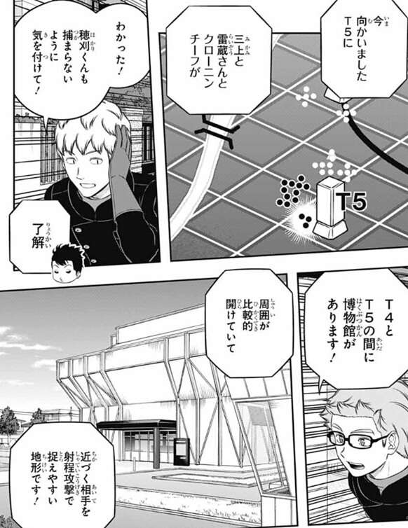 生駒が移動しながら来馬隊と水上隊に香取に便乗した経緯を説明していた時、監視していた穂刈から追ってきているのが太刀川隊、冬島隊、加古隊、風間隊だと連絡が入ります。そして、さらにT5に三上と寺島雷蔵、クローニンが向かったと穂刈から連絡が入ります。この連絡を聞いた古寺はT4とT5の間に博物館があるので、3番隊から11番隊は博物館を目指すように指示します。博物館は周囲が開けていて近付く相手を射程攻撃で捉えやすい地形なので、博物館でA級部隊を待ち構えて射程攻撃で対応する作戦のようです。