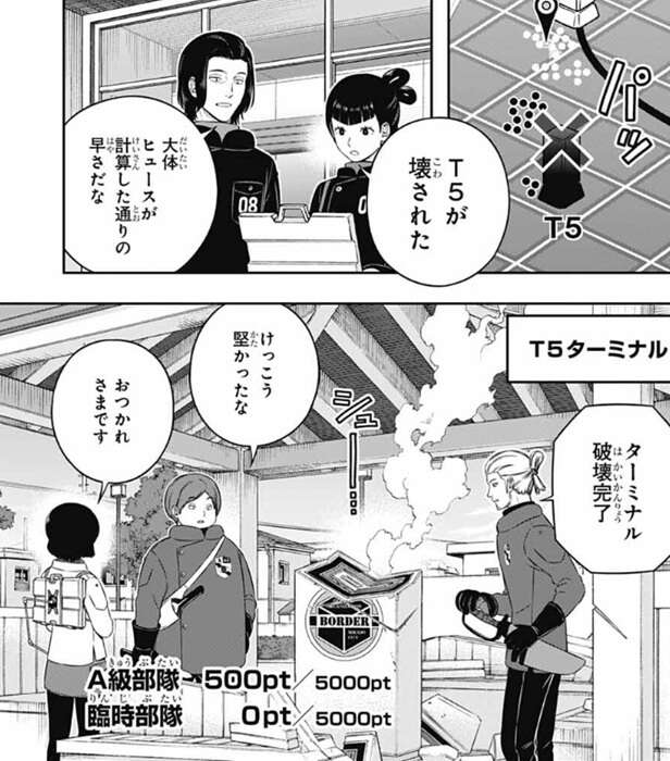 三雲は荷物を置いておいて身軽になると、諏訪7番隊と柿崎3番隊も博物館を目指します。隠岐はA級部隊が初っ端からぐいぐい来ると言い、犬飼は前線には二宮や複数のスナイパーがいるので撃ち合いでは負ける事もなさそうだけど……と言いますが、影浦は弾を撃たせまくってトリオンを減らす消耗戦狙いかもしれないとA級部隊の考えを推測します。臨時部隊が博物館での合流を急いでいる頃、寺島とクローニンがT5ターミナルの破壊を完了します。T5ターミナルが破壊されA級部隊に500ポイント入りますがオペレーターの三上は休むことなく、急いで風間さんと合流しましょう、と言い三人も博物館の方角へ向かいます。