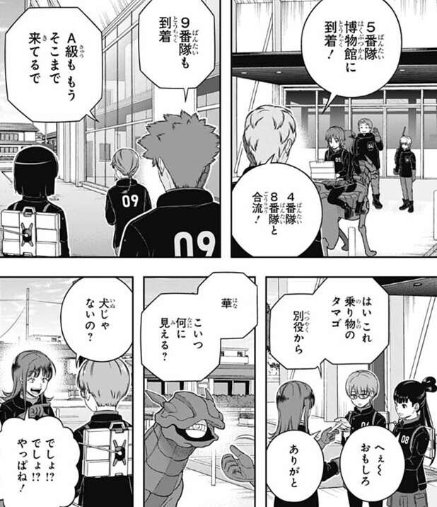 博物館では来馬隊と水上隊が北添隊と二宮隊に合流、香取が染井と加賀美に馬のトリオン兵のタマゴを渡します。A級がもうそこまで来ていますが香取は染井に馬のトリオン兵が何に見えるか尋ね、染井が犬だと答えると、でしょ!?でしょ!?やっぱね!と、トリオン兵の外見について二人は話しが盛り上がります。その後、博物館に合流した部隊の指揮を、古寺は一時的に東に代理で任せます。遠征経験者は全体の指揮官にはなれませんが、一部の部隊の指揮ならありのようです。