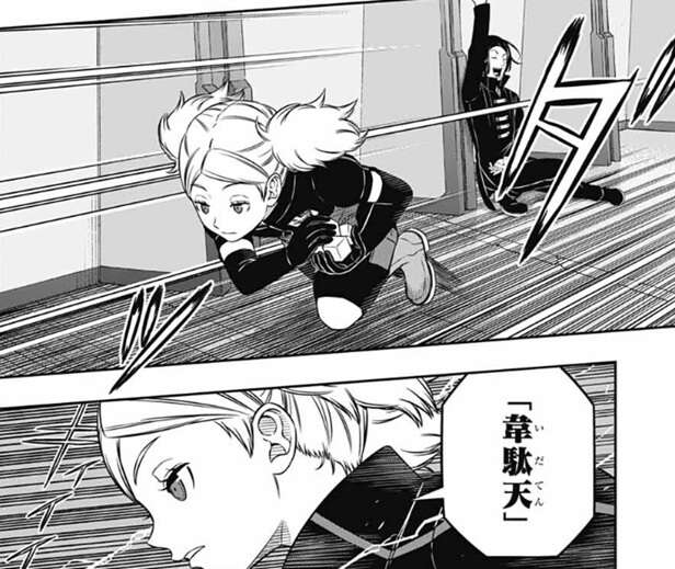 射程組が高速移動する黒江を狙撃しますが、韋駄天のスピードを捕えることは出来ず黒江は一気に窓ガラスを蹴破って博物館に侵入します。博物館に入った黒江はキューブ状のトリオンを展開、冬島のワープの出口になります。