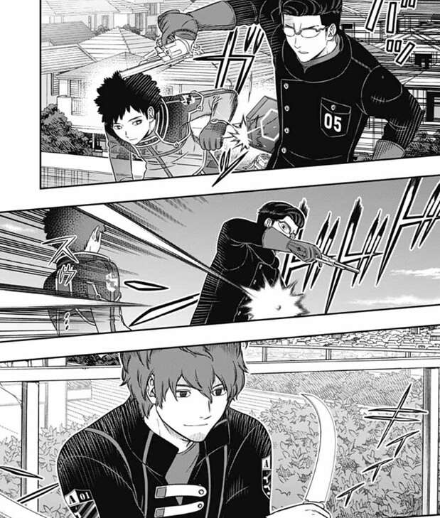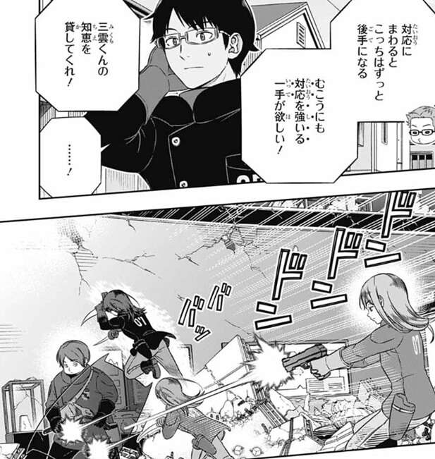 古寺は三雲に、対応にまわるとこっちはずっと後手になる、むこうにも対応を強いる一手が欲しい!と言い、三雲の知恵を借りようとします。一方、雷蔵と戦うことになった香取は銃で牽制しつつ間合いを詰めて、スコーピオンで接近戦を仕掛けます。