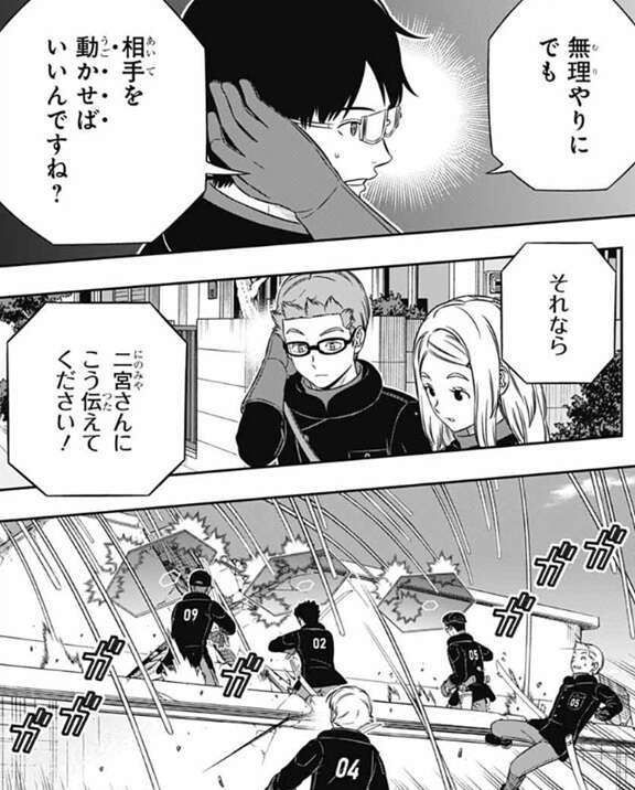 香取達が脱出出来ず、A級部隊の様子を窺っていた頃、古寺の対応を強いる一手が欲しいとの指示を受けた三雲は、無理やりにでも相手を動かせばいいんですね?と、古寺に確認した後、三雲は二宮にこう伝えてくださいと古寺にお願いします。