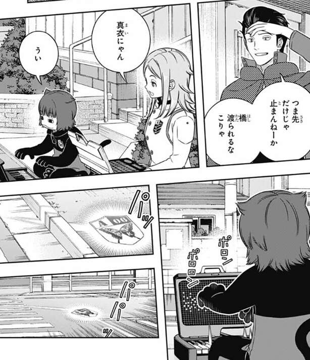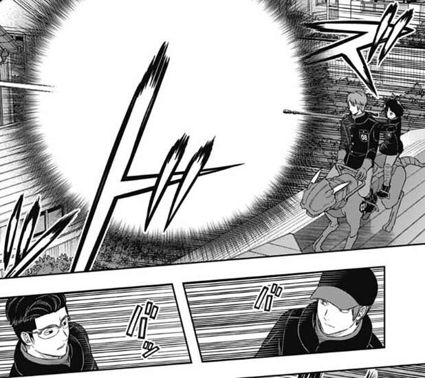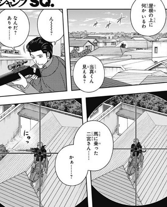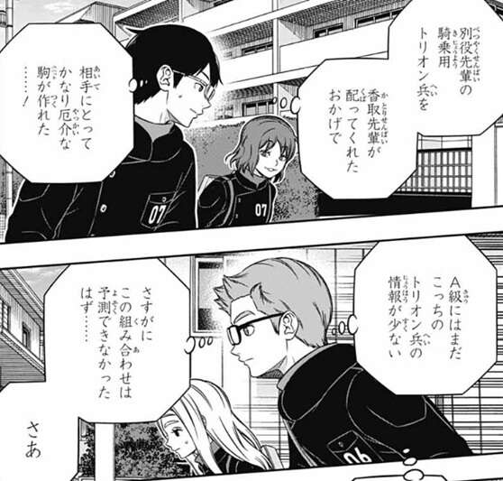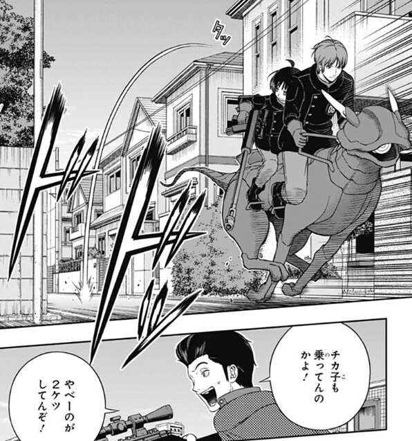 一方、屋外にいる荒船や生駒達が、出水や加古の射撃攻撃にやられていますが、加古が屋根の上に何かがいるのを見つけます。加古は当真に屋根の上に何か見えるか確認し、当真がスコープで確認すると、そこにいたのは別役の騎乗用トリオン兵に乗った二宮と雨取の姿でした。