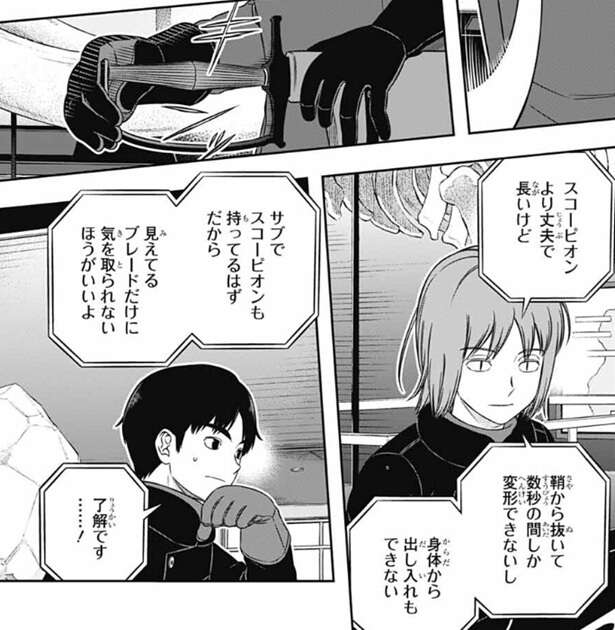 スコーピオンより丈夫で長いようですが、鞘から抜いて数秒の間しか変形できず、クローニンもすぐに鞘に戻します。また、スコーピオンと違って体から出し入れも出来ないようですが、クローニンはサブでスコーピオンを持っているはずだから、見えてるブレードだけに気を取られないよう、菊地原が樫尾に注意を促します。