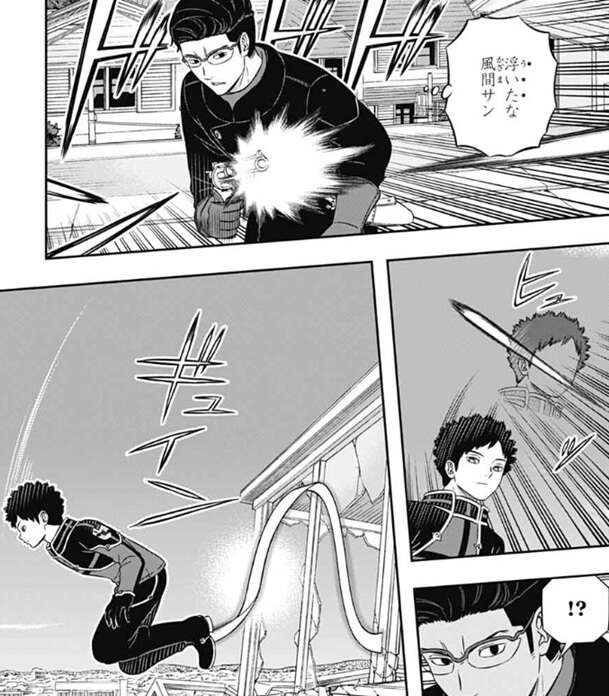 博物館の屋上で戦っている生駒は旋空弧月で太刀川と風間を攻撃し、風間が浮いた所を弓場が撃って仕留めようとしますが、風間は足から出したスコーピオンを器用に使って空中で体勢を変えると、弓場の弾をかわします。