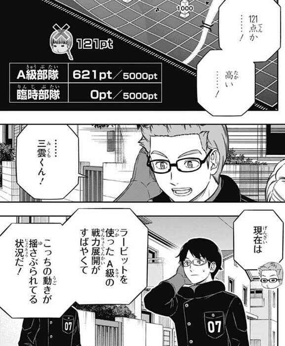 照屋の撃破点は121点で高く、A級部隊と臨時部隊の得点に差が付いてしまいました。指揮官の古寺はこのままではまずいと、ラービットを使ったA級の作戦によって臨時部隊の動きが揺さぶられている今の状況を三雲に伝えます。